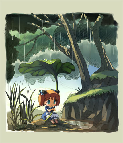 サトイモの葉っぱ(?)で雨宿りをするのが、びんちょうタンではなくクヌギたんというのが珍しいですね~。